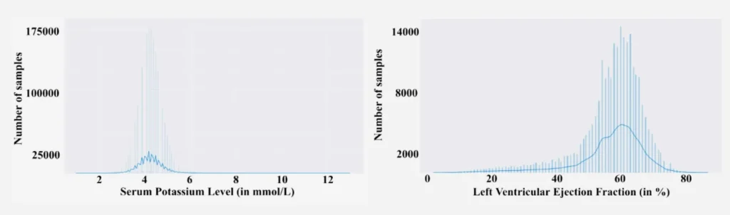 In clinical datasets, rare conditions create skewed label distributions. A clear illustration is shown below: most patients cluster in the normal range, while critical abnormal values form a long tail. The data are highly imbalanced: most potassium values lie around normal (≈4 mmol/L) with very few cases above 6 (hyperkalemia), and most LVEF values cluster near healthy levels (~60%) with far fewer in the dangerously low range.